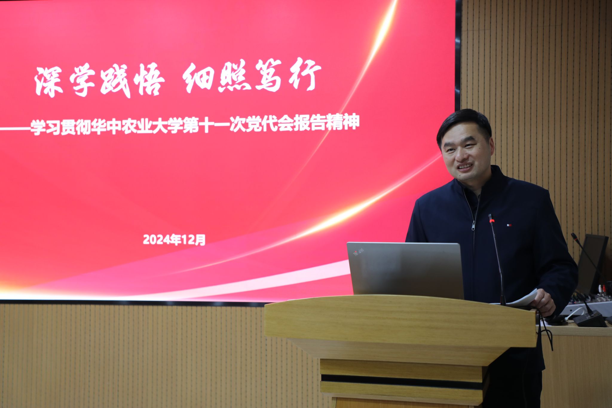 王从严以学校历次党代会召开时间为线,以凝练学校办学方向为点,结合学校整体进入“211”、“双一流”等重大事件解读了“以质图强,融创致新,奋力谱写建设特色鲜明世界一流大学新华章”奋斗目标形成的历史脉络和现实要求;重点以学校在创新人才培养、战略科学家培育、科技战略性平台创建和一流文化建设等4个方面取得的新突破总结回顾了第十次党代会以来取得的新业绩,系统阐述了新时期学校发展的办学理念、战略指引、奋斗目标的深刻内涵,详细解读了发展思路和八大行动十三项计划五大工程的具体任务。他强调,要把握历史方位、认清时代背景,坚持“五个必须”,树牢质的导向、坚定强的抱负、强化融的思维、用好创的驱动,未来十年把学校打造成世界高等农业教育高地、农业科技创新策源地和优秀人才富集区。他要求,要学深悟透报告,领会精神实质,对标目标任务,细化实施方案,强化协同融合,深化改革创新,勇于担当作为,全力推进党代会战略部署落地生根。报告中,他对原理学院、英国上市365在支撑学校“双一流”建设过程中发挥的重要作用、在推进“双创”工作取得的成绩给予充分肯定,希望全体化学人在高质量教育教学、高水平科技创新和高素质人才队伍建设方面主动认领新任务,在建设世界一流大学新征程中做出新贡献。