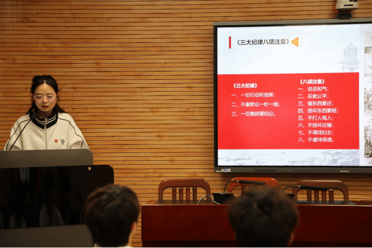 在中南财经政法大学马克思主义学院的理论分享环节,研究生党支部的杨茹媛同志从《三大纪律八项注意》这一我党历史上重要的行为准则讲起,结合两个生动的抗日战争时期的故事,深刻阐述了铁的纪律对于革命胜利和党的建设的极端重要性。随后,她聚焦中央八项规定精神,系统分析了在全党深入开展学习教育的重大意义:“这不仅是巩固拓展主题教育成果的必然要求,是解决当前党内作风建设突出问题的现实需要,更是以中国式现代化全面推进强国建设、民族复兴伟业的坚强保障,也是我们党在新征程上不断继承和弘扬光荣传统、优良作风的关键举措。”她的讲解深入浅出,使党员们对新时代加强党的纪律建设有了更深的理解。