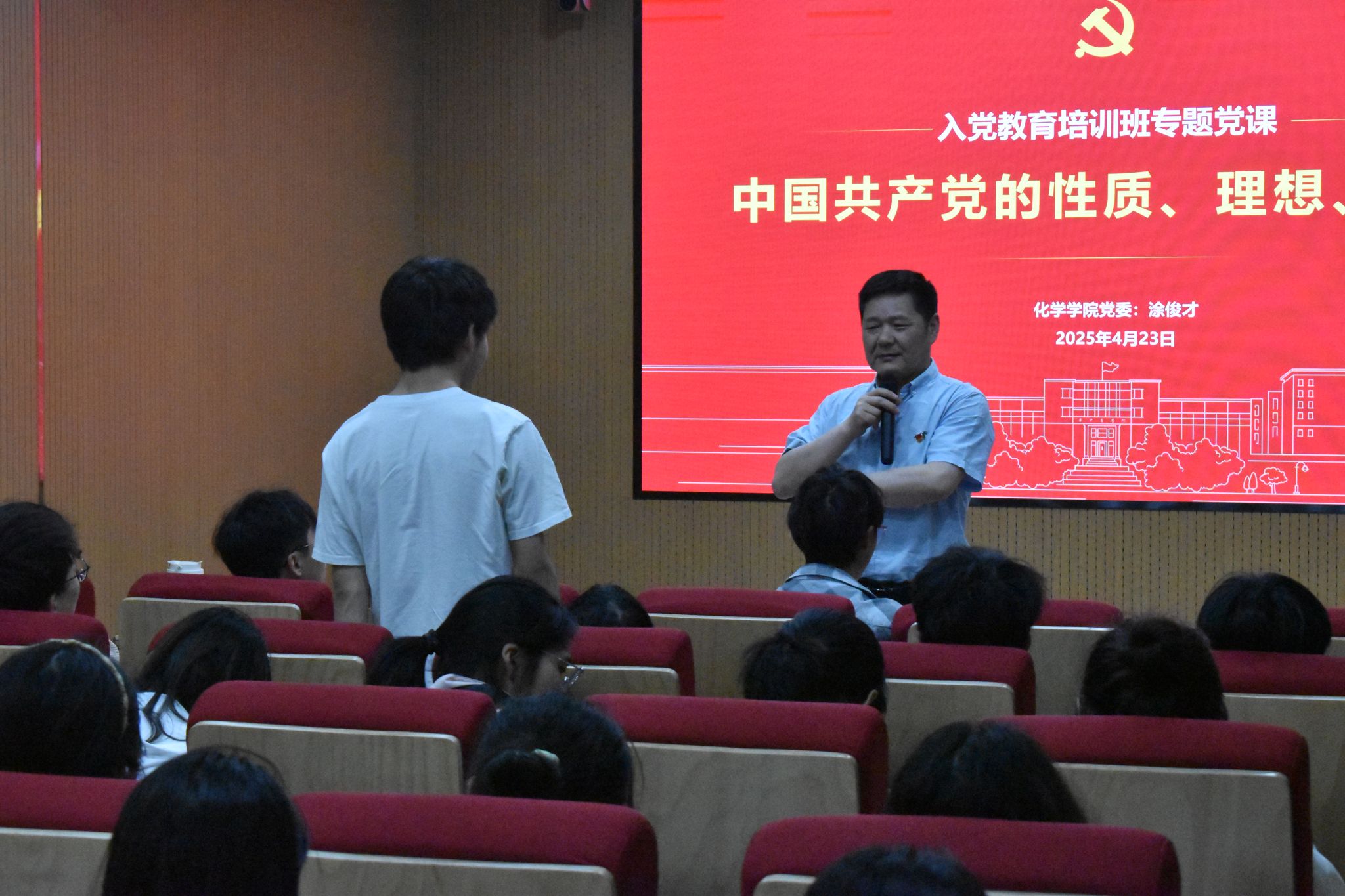 (通讯员:张金秋)4月23日晚,英国上市365党委书记涂俊才在化学楼102报告厅为我院积极分子、发展对象、预备党员讲授了以“中国共产党的性质、理想、宗旨”为主题的入党教育培训班专题党课。