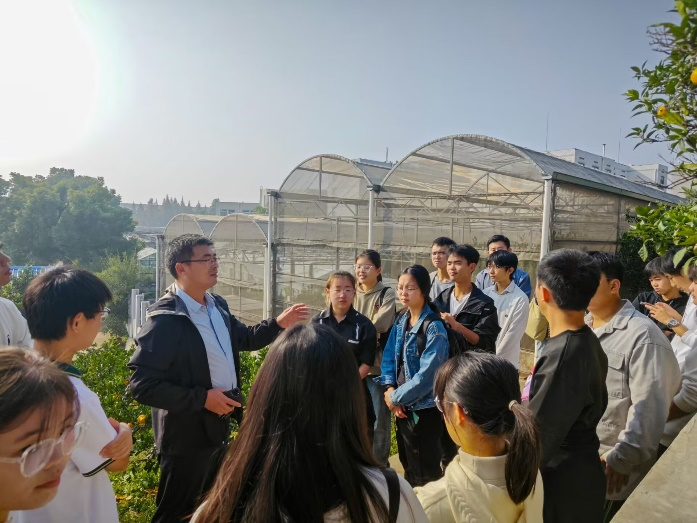 在参观活动进行中,园林学院张飞老师现身基地。“是最近在《Science》发表论文的老师啊!”同学们自发聚集在张飞老师周围,眼神里充满“膜拜”,近距离与专家交流。张飞老师用风趣幽默的语言与同学们亲切交流柑橘科研的趣事,深入浅出地分享当初潜心研究柑橘油胞的心路历程。在谈到化学学科的时候,张飞老师说现在生物领域的分子技术和基因测序等方向都与化学息息相关,尤其是分子生物技术。他列举了近几年诺贝尔化学奖,如绿色荧光蛋白质、基因编辑技术、冷冻电子显微镜就是与生物相关的研究成果,生物从某些方面来看就是化学的生命表达形式,化学其实一直在科学前沿。他勉励同学拓宽眼界,练好基本功,厚积薄发,并欢迎有兴趣的同学们可以与之联系。