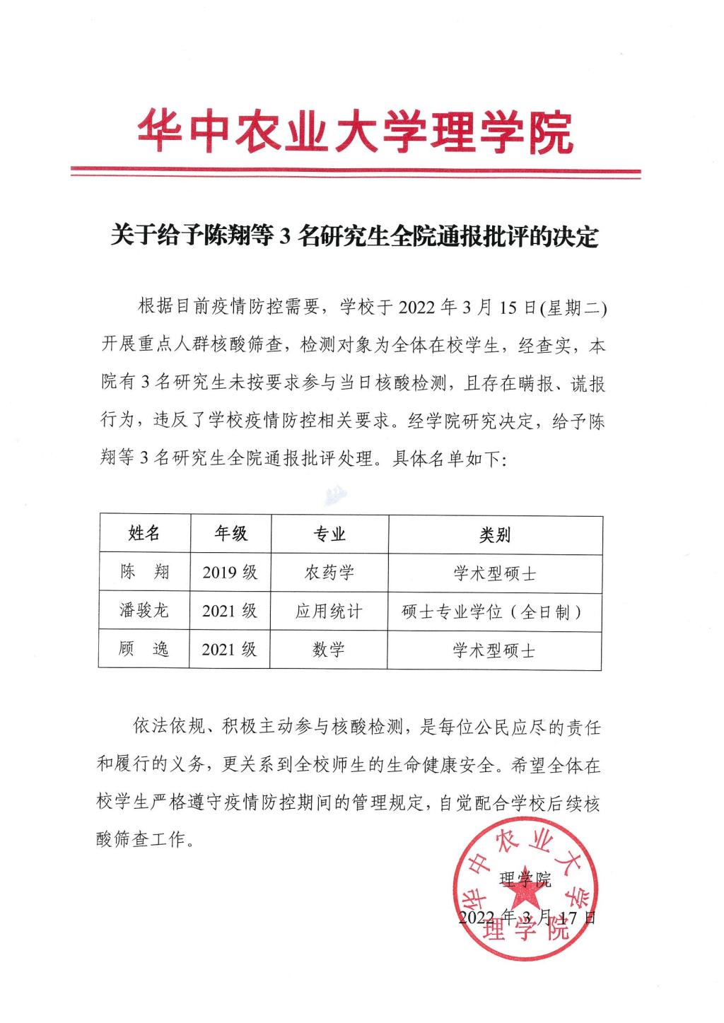 关于给予陈翔等3名研究生全院通报批评的决定