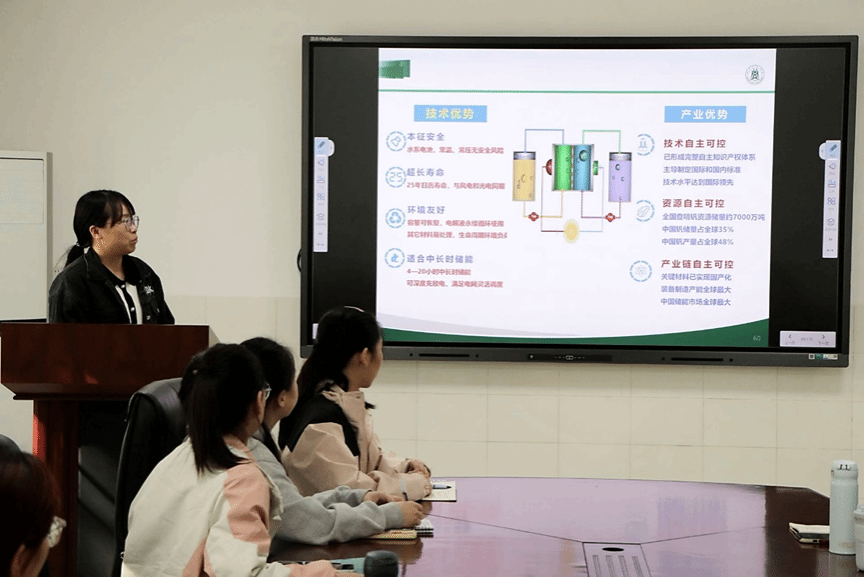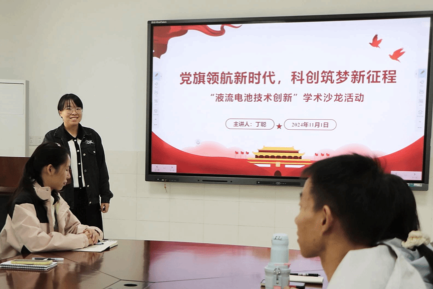 活动伊始,党支部书记赵典强调了科技创新在新时代的重要性以及党对科技创新工作的领导作用。随后,随丁聪老师以宏观视角阐述了液流电池技术在当今能源格局中的关键地位。液流电池作为一种电化学储能技术,在可再生能源存储与利用方面展现出巨大的潜力。丁聪老师通过专业且系统的讲解,从基础原理到结构设计,再到实际应用场景,为在场的研究生们绘制了一幅全面而清晰的液流电池技术蓝图,使大家对这一复杂而前沿的技术有了深入透彻的理解。