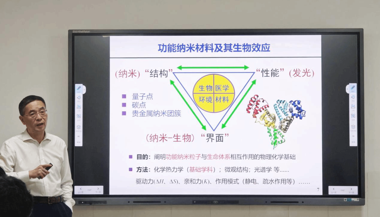 在学术报告中,刘义教授以深厚的学术造诣,首先系统梳理了新型功能纳米材料及其生物效应的研究脉络与前沿动态,通过生动形象的比喻将复杂的理论体系娓娓道来,为听众构建起该领域的全景式认知框架。随后,刘义教授重点分享了其团队在纳米材料表面修饰策略创新及静电肿瘤诊疗新疗法等领域的突破性进展。借助详实的实验数据与典型案例,他深入阐释了如何通过精准分子设计优化纳米材料的肿瘤靶向性,并详细论证了静电诊疗这一创新疗法的分子机制与临床转化潜力。报告内容层层递进,既有理论高度又具实践指导价值,引发了在场师生的深度思考。在互动环节中,师生们踊跃提问,就纳米材料生物相容性、静电疗法临床应用前景等问题展开探讨。