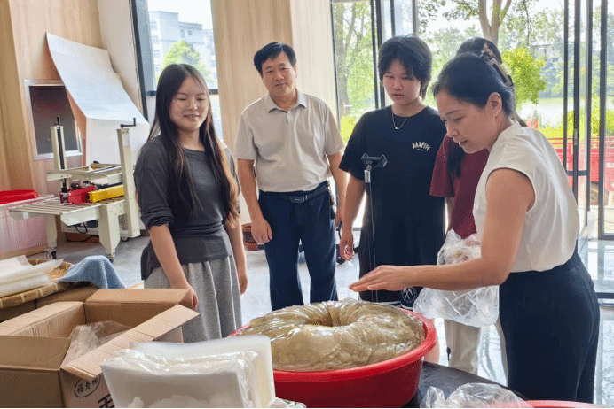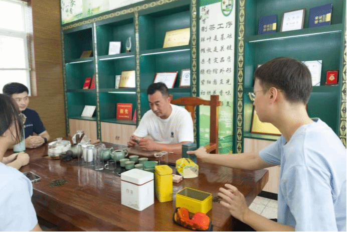 7月20日至21日,实践队分别赴长辉云雾茶叶有限公司、河南省农都农业发展有限公司进行实地调研学习。在长辉云雾茶叶有限公司,队员们亲手采摘茶叶,并深入茶叶加工车间,学习信阳毛尖的制茶工艺。在交流环节,长辉云雾茶叶有限公司负责人龚长辉指出,当前信阳毛尖仍面临宣传力度不足、新茶饮市场缺失等问题,但是他将继续坚守并深耕毛尖产业,扎根乡土,助力乡村振兴。在河南省农都农业发展有限公司,实践队来到小龙虾、甲鱼的加工车间,详细了解了从原料入库、清洗分拣、精深加工到包装冷藏的全链条生产工艺和质量控制体系。此次实地走访让实践队对潢川县的特色水产产业有了更直观、更深入的认识,也为后续的助农直播选品和推广打下基础。