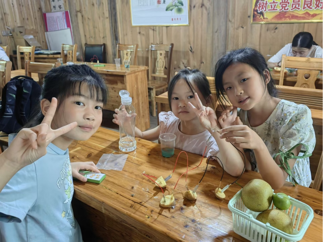 实践团队开设“趣味化学课堂”,以动手实验为载体,带领孩子们探索化学奥秘。 “水果电池”实验中,孩子们亲手搭建简易电路,直观见证化学能转化为电能的奇妙过程; “化铁为铜”实验通过生动的置换反应,揭示氧化还原的化学本质; “大象牙膏”实验让孩子们初步认识化学原理,锻炼动手能力和观察能力 ...... 这是一次趣味与知识的交融、动手与动脑结合的科普实践,展现了“玩中学”的魅力,激励他们带着好奇心开启科学探索之旅。