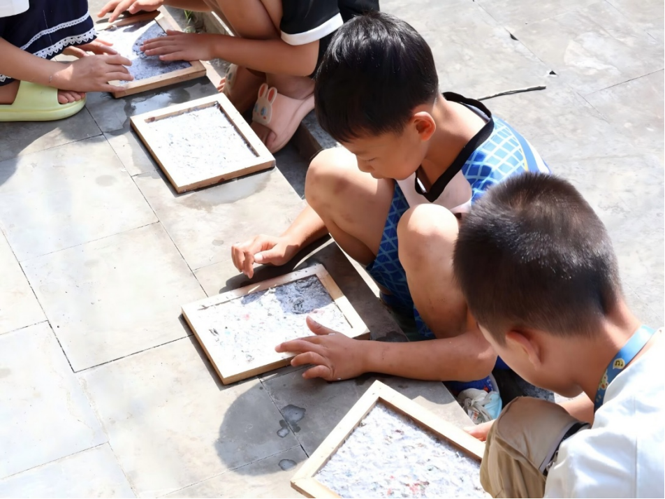 将知识竞赛与实践体验结合,让一场 “传统文化大比拼” 点燃热情。 成语接龙大战里,由实践团队成员出题,小朋友们30秒头脑风暴疯狂输出,背诵经典诗词、典故,在竞赛中感受传统文化魅力。 实践队员还化身 “传统文化魔法师”,带着小朋友们钻进四大发明之造纸术的奇妙世界。 小朋友们小组合作,通过泡纸、捣碎、捞纸等步骤,深入了解了有着 1200 年历史的宣纸。