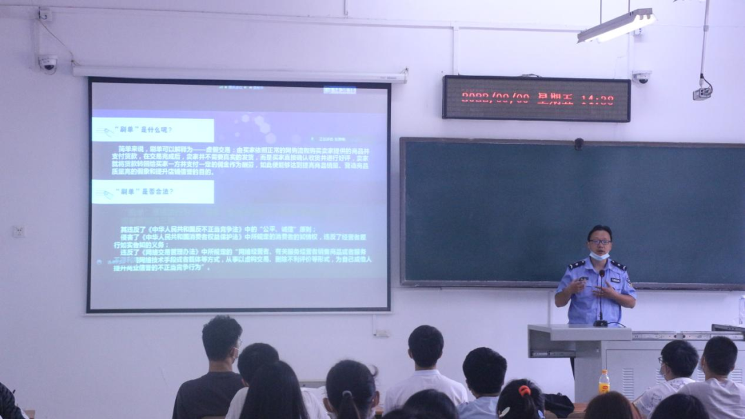 讲座开始后,民警通过发放宣传材料、现场讲解等方式,提醒同学不轻信来历不明的电话和信息,不向陌生人透露自己及家人的身份信息、存款、银行账号等重要信息。并且列举了几种常见的诈骗类型,一是冒充朋友或家人向自己发短信、打语音电话,拜托“紧急”汇款,然而未见其人,结果被骗;二是通过刷单,开始会给予小份额的收款到账,获得信任后一步步引诱同学转钱,最终得不偿失;三是网络购物时诈骗团伙冒充客服,以货物出现问题为由,发来不明链接,向手机中植入病毒等等。