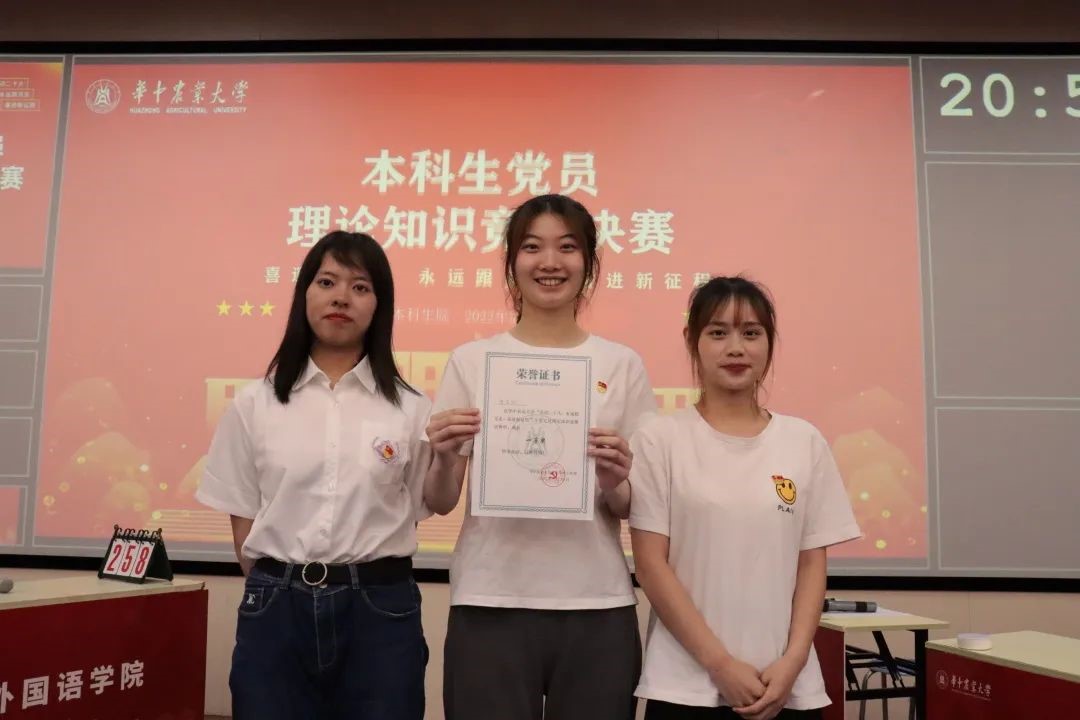 (通讯员:邓莎莎 王保怡 谭粧升)5月26日晚,由我校党委组织部、党委宣传部和本科生院主办的“喜迎二十大 永远跟党走 奋进新征程”党史知识竞赛在农业微生物国家重点实验室B座一楼汇报厅举行。我院三位选手钱忆宁、杨颖、钟瑞芹以337的分数荣获一等奖。