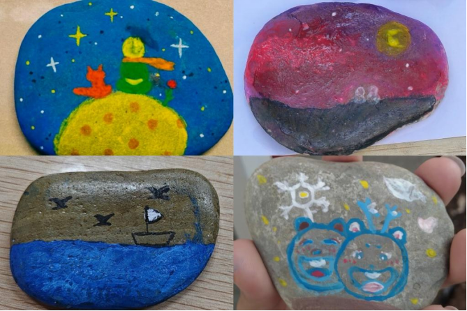 活动伊始,活动发起人将石头、水彩等材料分发给学生们,耐心地讲解制作步骤和技巧,并进行现场演示。通过底色涂刷,图案选择,保护层封层等一步步操作,学生们让一块块灰色的小石头在手中焕发光彩,变成了具有创意、形式新颖的“艺术品”,每一个作品都凝聚着同学们的艺术想法与独特创意。