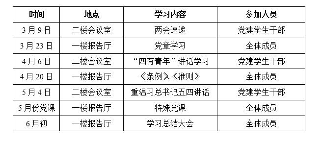 集体学习主要包括:每两周举办党建系统学生干部集体学习交流会; 每月一次全体党员、重点培养对象及党建系统学生干部集体学习。集体学习主要由党发部负责,每次主讲人包括辅导员、2-3名学生党员等,要求提前熟悉学习内容。