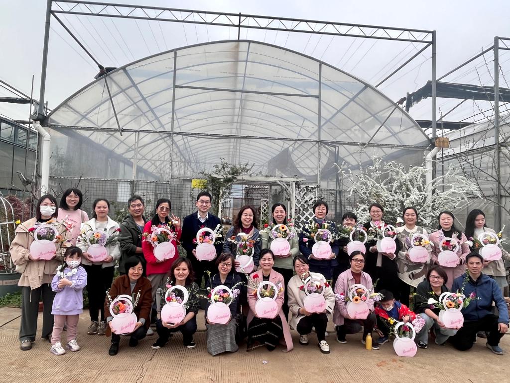 为构建温馨和谐美好的育人环境,以花润心,以心暖人,丰富教师精神面貌,促进师生融乐,恰值三八妇女节,我院工会在校花卉基地开展了“花之物语、插花品香” 主题活动。学院40余名教师积极参与了活动。3月8日下午3点老师们徒步到南湖边的花卉基地,在花海中与自然相拥,被花香环绕。