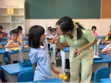 课程结束后,傅喆老师给同学们分发“膳食宝“摆礼品,同们开心激动,简单又纯粹的快乐感染着老师