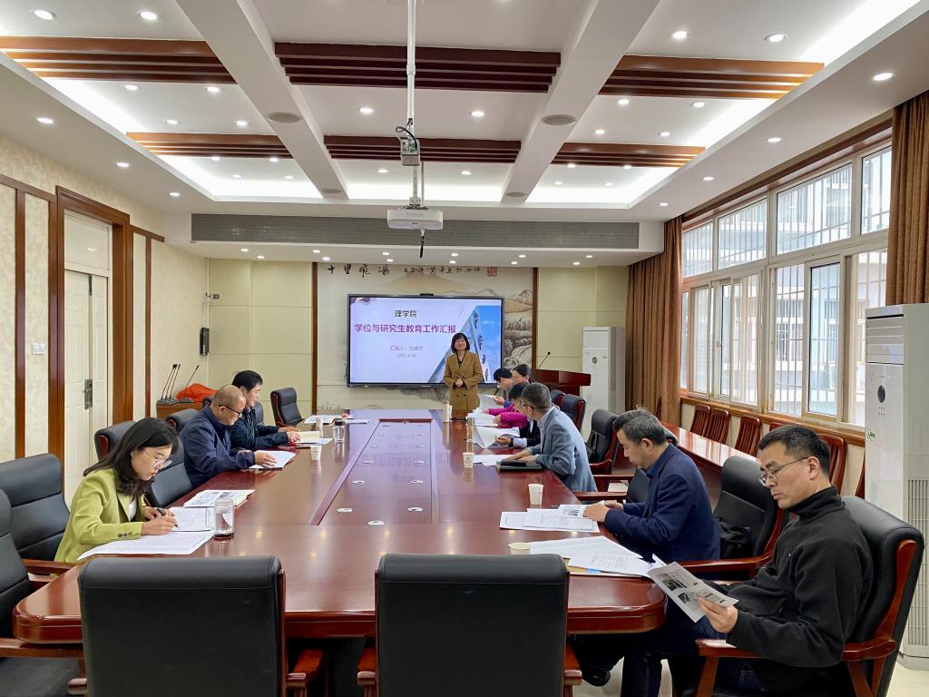理学院党委书记涂俊才、院长谭佐军分别就学科规划与学科建设、研究生培养条件建设等情况进行了汇报。副院长沈婧芳就学位与研究生教育工作年度建设目标任务推进情况作了专题汇报。副书记祝鑫就2022届毕业研究生的毕业就业工作进展进行了专题汇报。