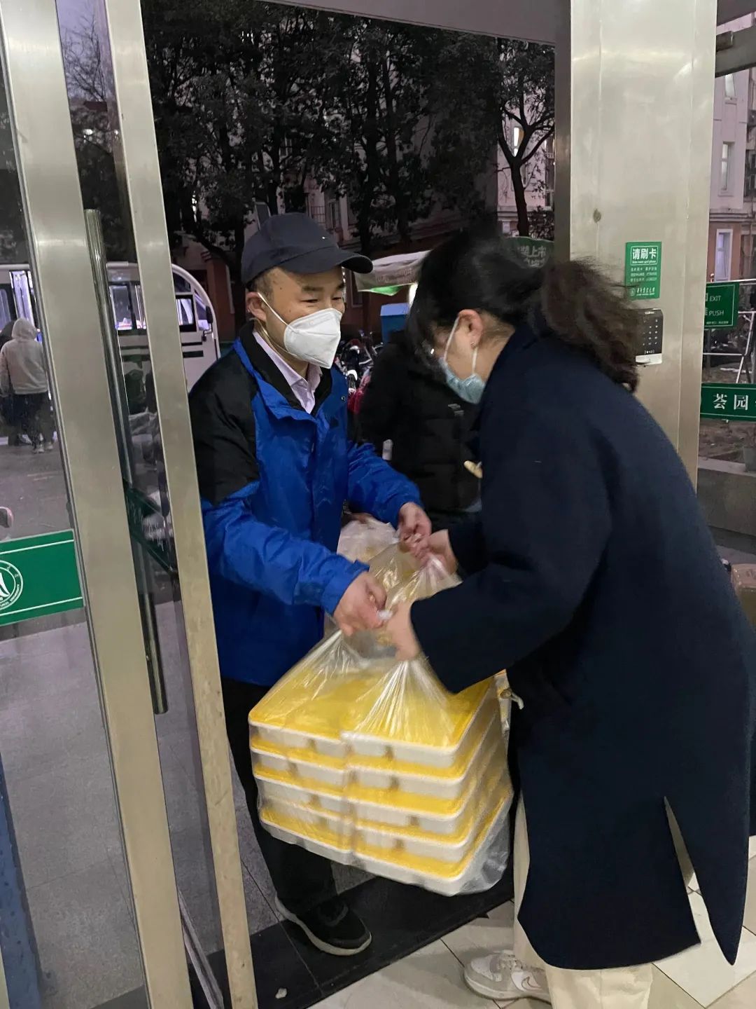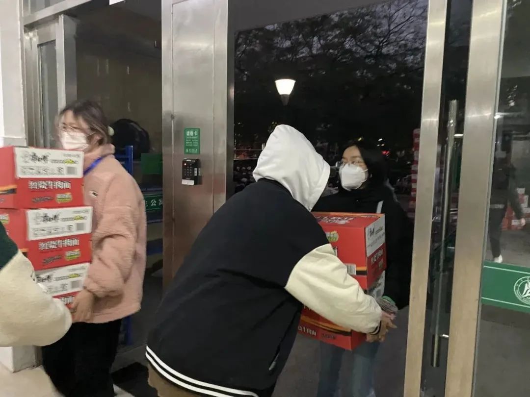 为了保证大家在宿舍也能及时拿到物资,就有了那么一群逆风前行的人,他们挺身而出,在志愿者队伍中,不仅有我们身边的同学们,还有主动加入志愿者队伍的班主任老师们。理学院的班主任老师主动在早中晚三餐送餐时间,提前在荟一楼下等候,帮助运送八百多名同学的餐食及生活物资。