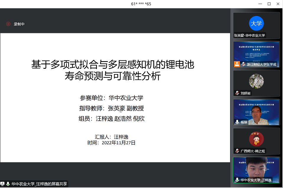 (通讯员:汪梓逸)由全国应用统计专业学位研究生(MAS)教育指导委员会主办,全国工业统计学教学研究会、中国现场统计研究会及中国统计教育学会高等教育分会协办,浙江财经大学承办的第五届全国应用统计专业学位研究生案例大赛颁奖典礼于2022年11月27日线上举行,经全国应用统计专业学位研究生案例大赛评审委员会评审,大会宣布了第五届全国应用统计专业学位研究生案例大赛评奖结果,我院张英豪副教授带领的硕士研究生汪梓逸、赵浩然、倪欣的案例作品《基于多项式拟合与多层感知机的锂电池寿命预测与可靠性分析》获得了该大赛的一等奖并作了相应作品的大会报告,邹翠明副教授带领的硕士研究生黄倩和王世远的案例作品《基于正交多项式拟合方法的锂电池失效时间预测》获得了大赛的二等奖。