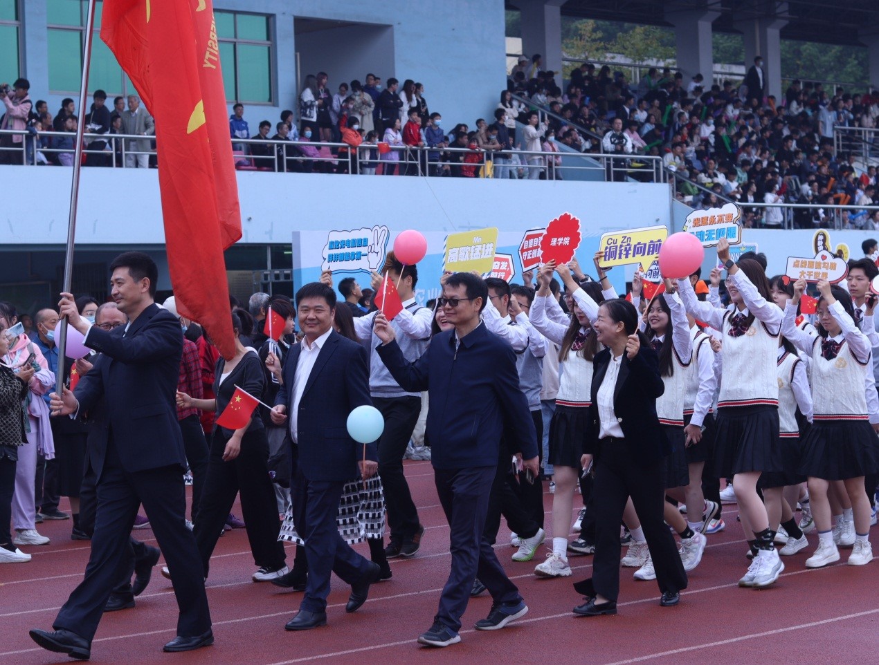 入场式上,各学院独居创意的方针体现了学科特色和运动精神。理学院方队中的同学们身着学院风的服装,体现着理学人的青春洋溢。同学们手中拿着“光速永不变,运动无极限、高歌锰进、铜锌向前、点线面体勾勒大千世界、生命在于运动”等富有我们理学院各专业特色的小展板,展现了理学学子力求“明德求理,务实拓新”的坚定!“应化光电信息,样样都能拿第一”,展现了理学院师生必胜的信念!