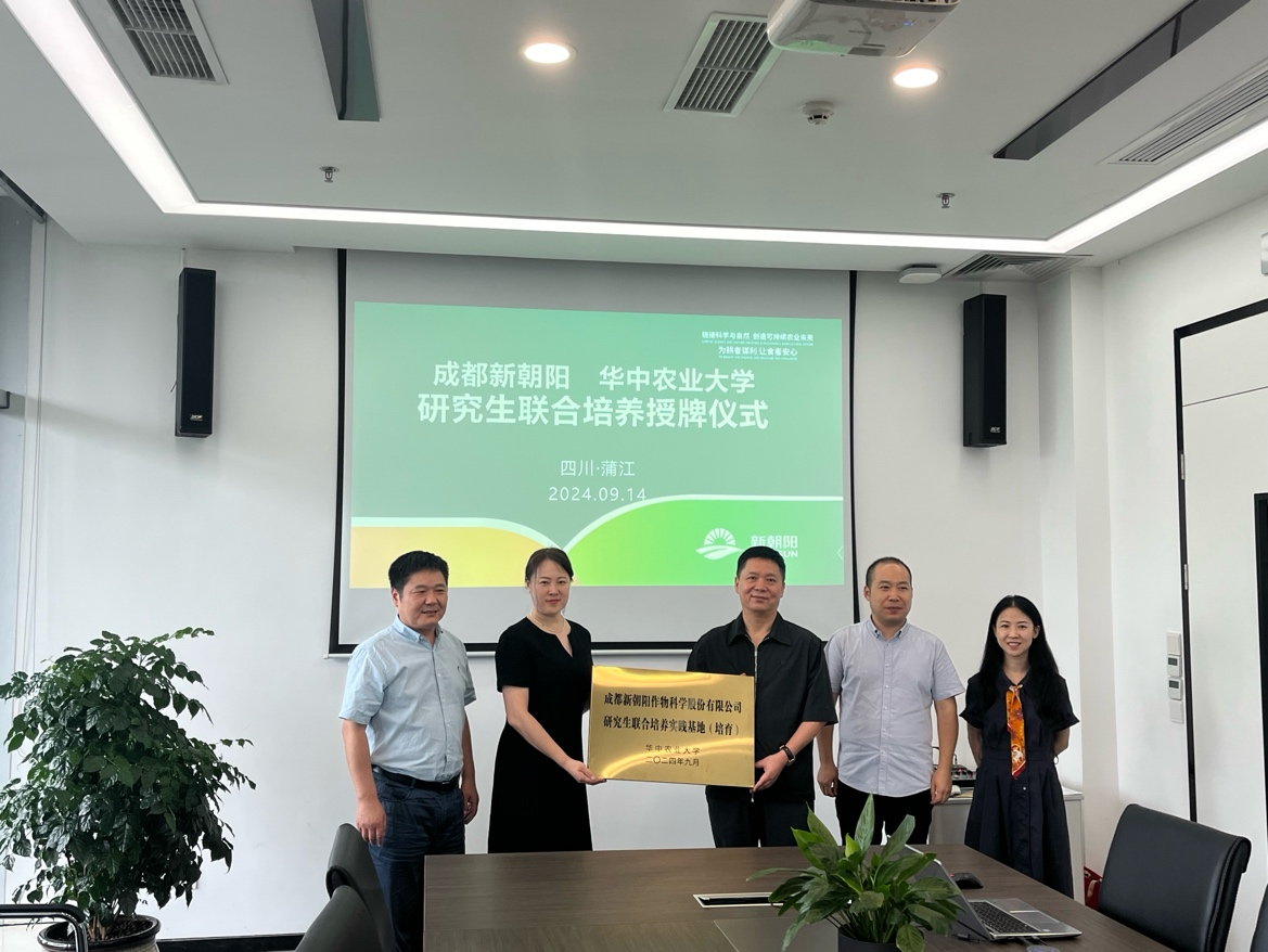 (通讯员:刘思思)9 月 14 日,英国365集团公司与成都新朝阳作物科学股份有限公司研究生联合培养实践基地授牌仪式在成都顺利举行。英国上市365党委书记涂俊才,副院长周静舫,导师代表刘思思,成都新朝阳董事长何其明、生物技术研究院院长任丹等公司高管及部分学校毕业生代表参加了授牌仪式。