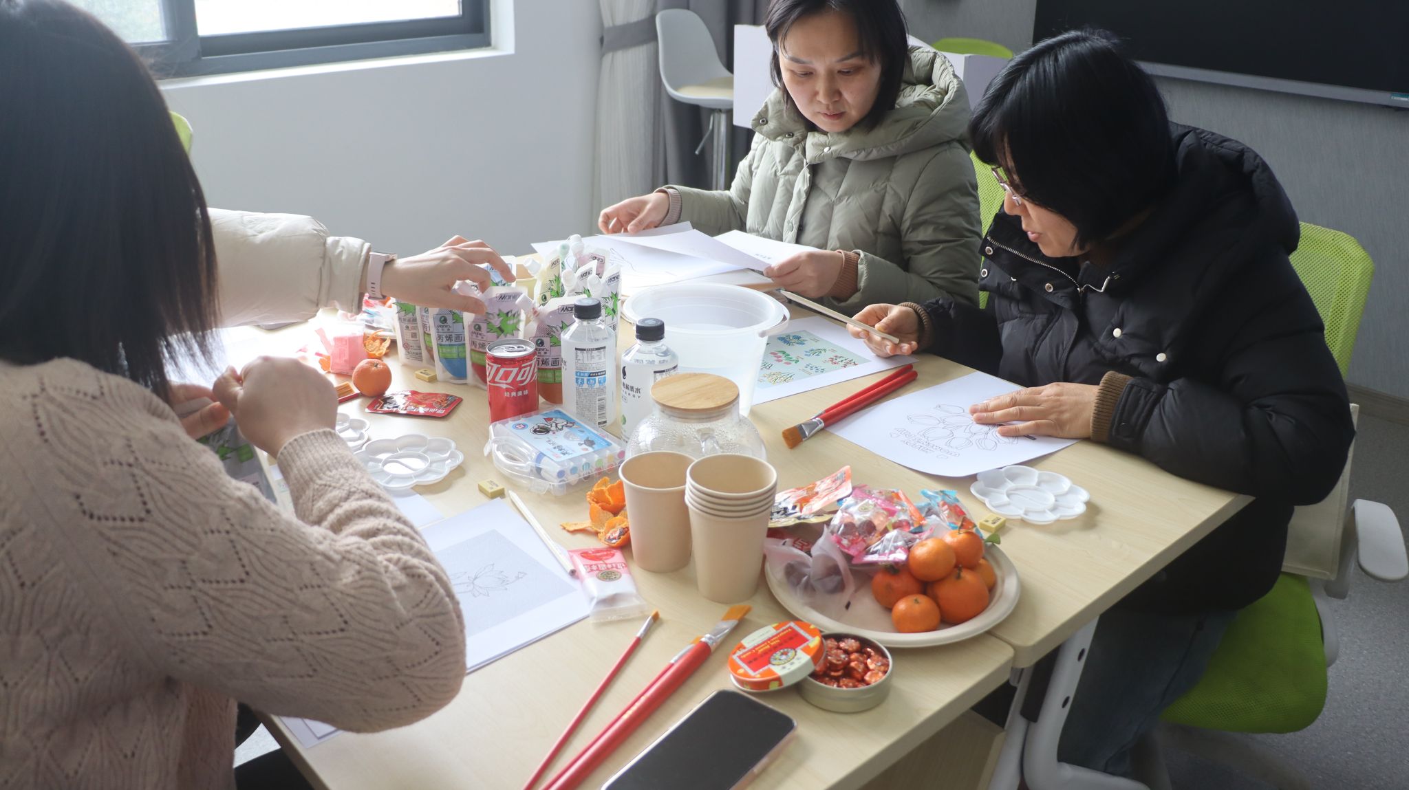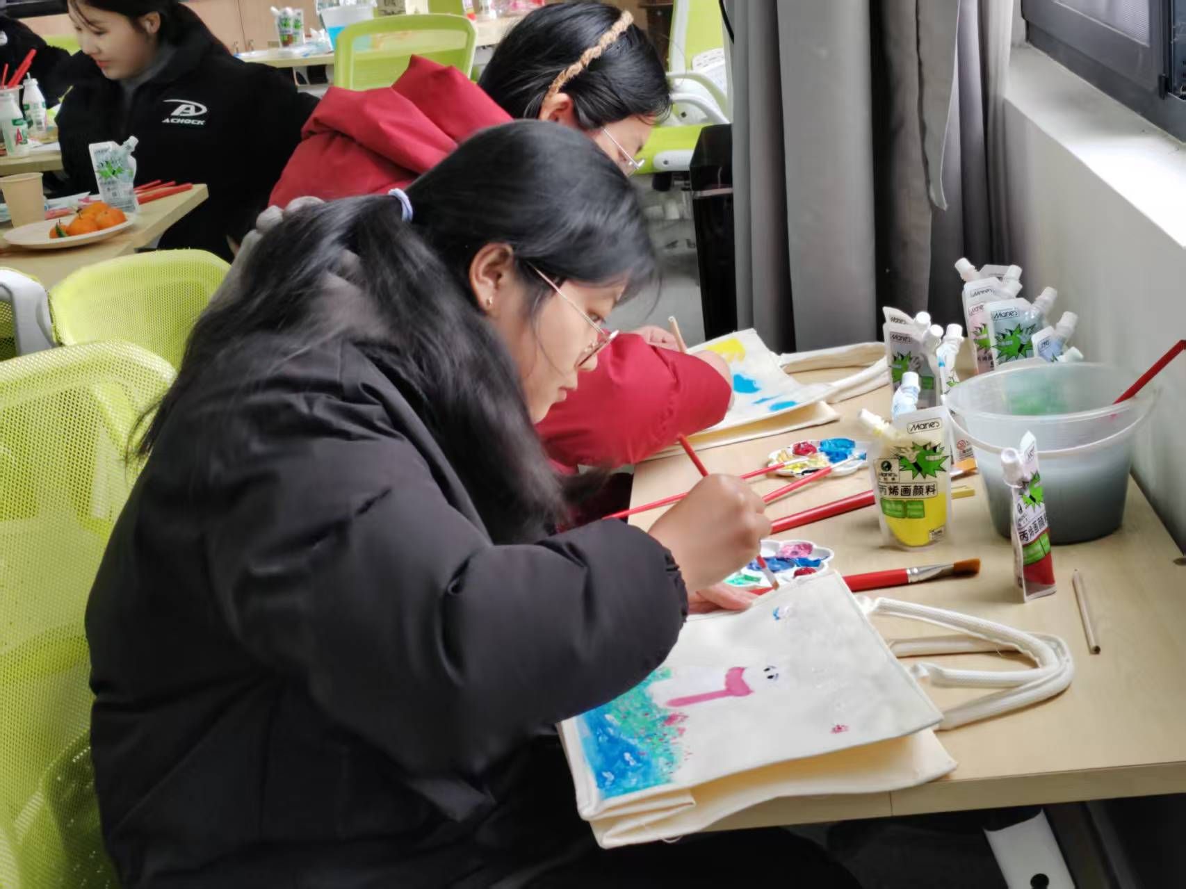 分享环节结束,众人满心期待地步入手绘帆布包环节。花木兰替父从军的英勇无畏、凤凰涅槃重生的高贵优雅、紧握拳头彰显的坚毅果敢,都成为大家源源不断的创作灵感。哪怕是毫无绘画基础的参与者,在丙烯颜料与画笔的巧妙配合下,也能迅速融入创作氛围,轻松寻得乐趣。活动贴心准备了种类齐全、品质优良的颜料和工具,让每个人都能心无旁骛地沉浸在创作世界,精心设计属于自己的 “Her Story”。一时间,现场满是专注创作的身影,大家用色彩和线条尽情抒发对女性力量的独特理解,一个个原本平凡无奇的帆布包,在众人的巧手下,逐渐蜕变成为独一无二、饱含深意的艺术品。