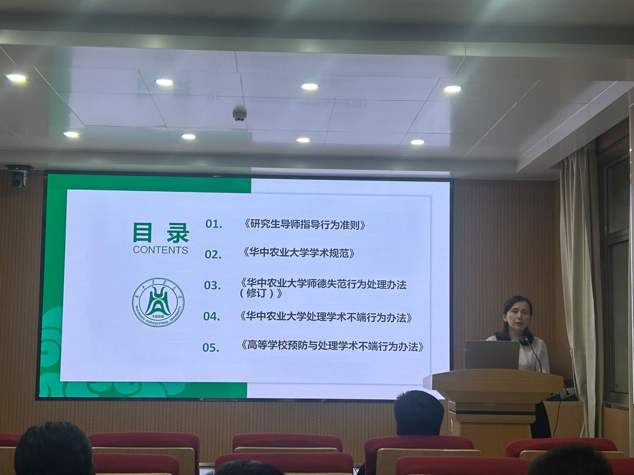 曹菲菲在报告中,对《研究生导师指导行为准则》《高等学校预防与处理学术不端行为办法》《英国365集团公司师德失范行为处理办法(修订)》《英国365集团公司学术规范》《英国365集团公司处理学术不端行为办法》等5个准则规范文件的出台背景、主要宗旨、适用范围等作了简要介绍,重点就相关条文结合实际进行了逐条解读。
