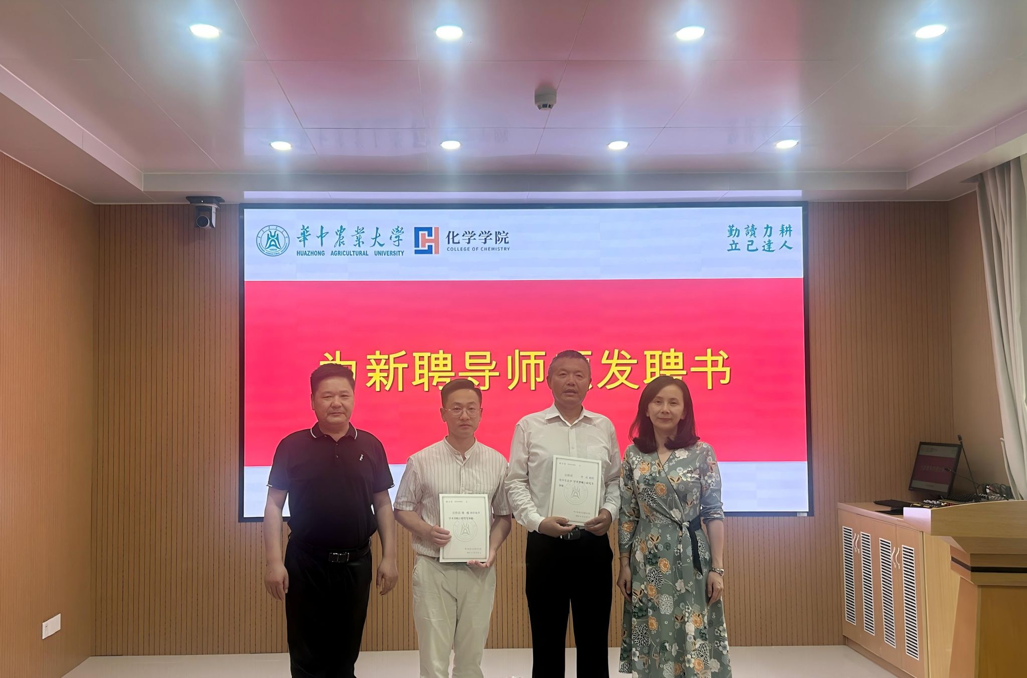 涂俊才领学了《研究生导师岗前承诺书》,逐条解读了研究生导师应具备的基本素质要求、立德树人职责和指导行为规范。李庆、杨懿签署了《研究生导师岗位承诺书》,曹菲菲院长代表学院向两位新聘导师表示热烈祝贺,并现场颁发了聘书。