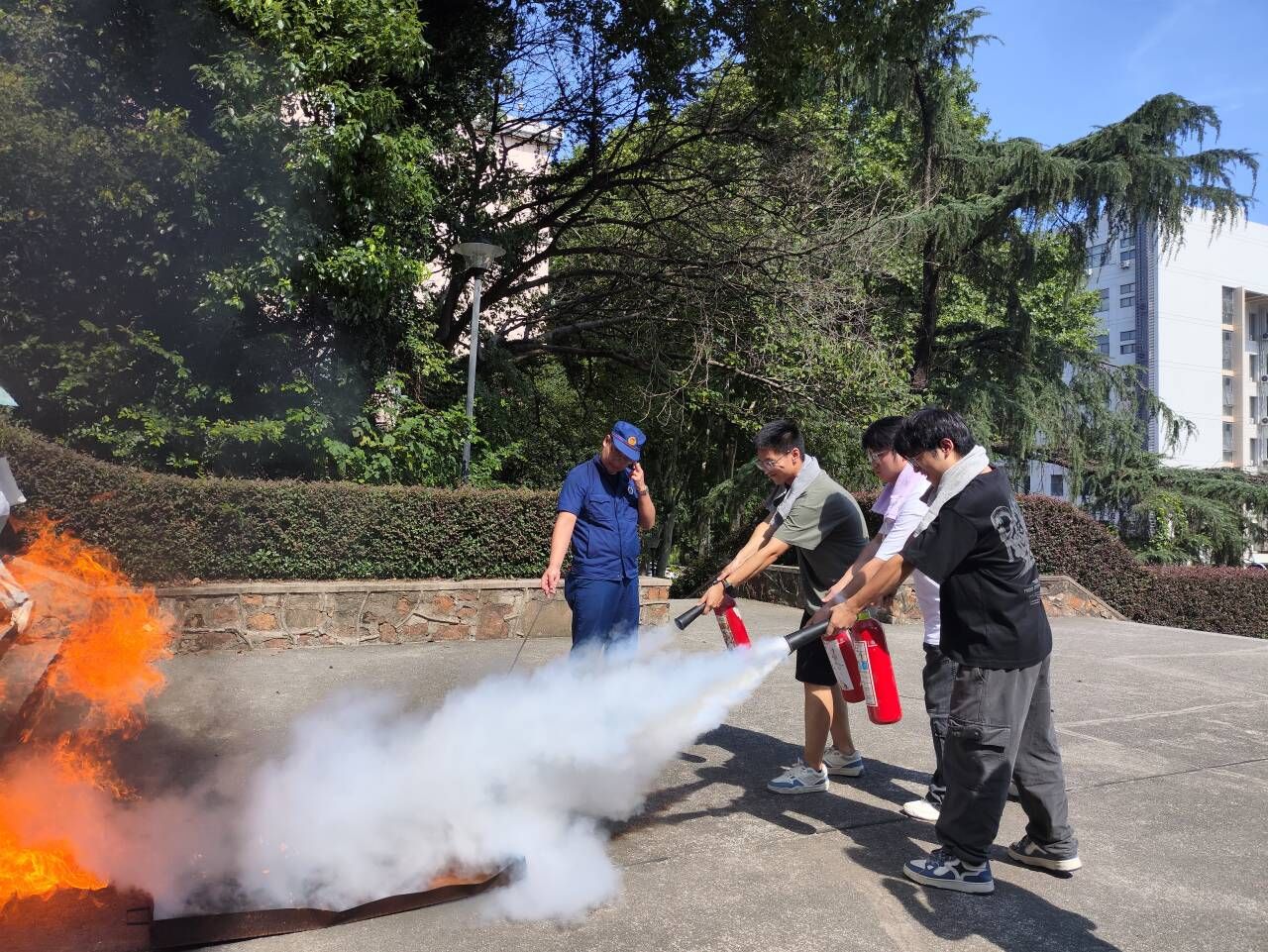 15 时 20 分,全体师生转至化学楼东平台,开展灭火器实操演练。建安部孙勇老师紧密结合化学实验室的特殊环境,深入剖析电器短路、设备过热、易燃化学品泄漏等典型安全隐患的成因与危害,随后详细拆解干粉灭火器 “提、拔、握、压” 的操作要领,着重强调操作过程中的安全注意事项。紧接着,师生们以三人小组为单位进行灭火实操,在建安部工作人员的一对一精准指导下,均成功精准扑灭火源,切实掌握实操技能。