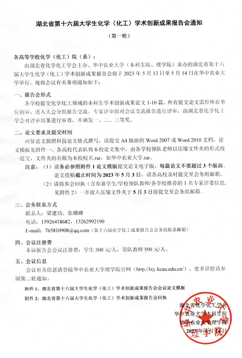 湖北省第十六届大学生化学(化工)学术创新成果报告会通知(第一轮)