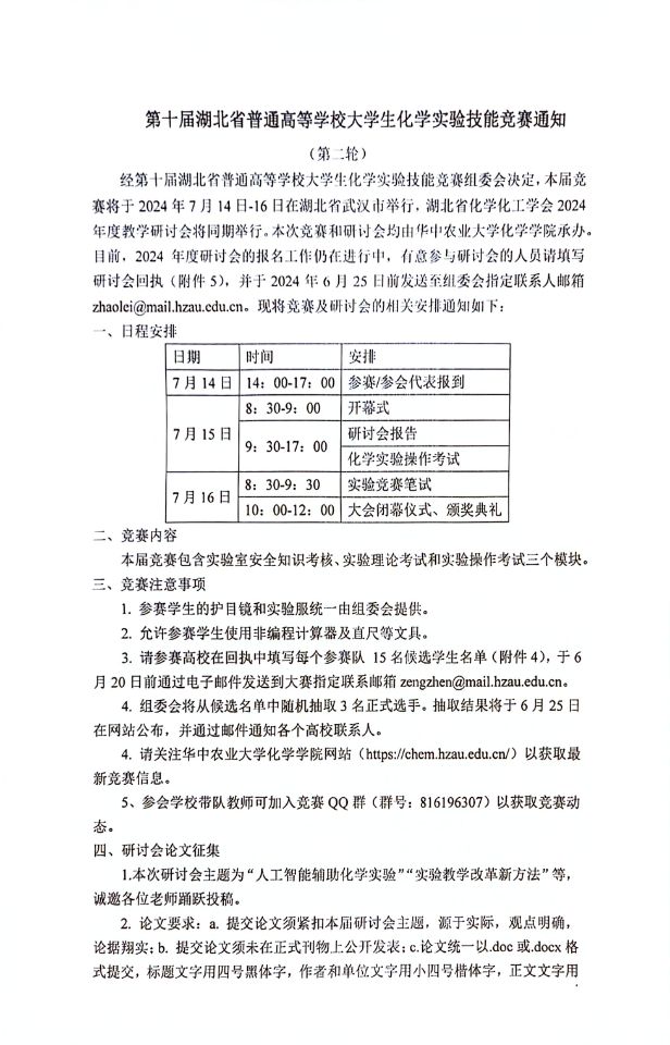 第十届湖北省普通高校大学生化学实验技能竞赛通知(第二轮)