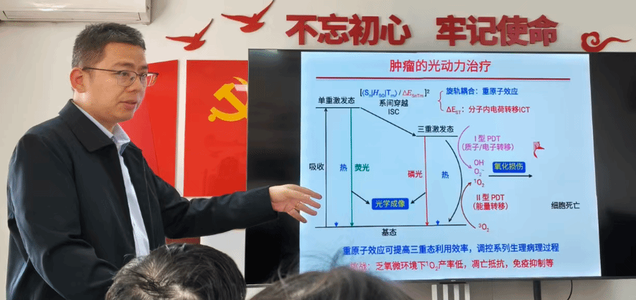 报告会上,陈韵聪老师围绕荧光探针设计及其在生物成像中的应用展开深入讲解。与会师生围绕报告内容展开热烈讨论,交流聚焦于细胞焦亡、凋亡、胀亡的时间线区分,以及荧光磷光三重态与单重态之间能级跃迁效率、淬灭时间等光物理机制问题。现场讨论深入、互动频频,学术氛围浓厚。