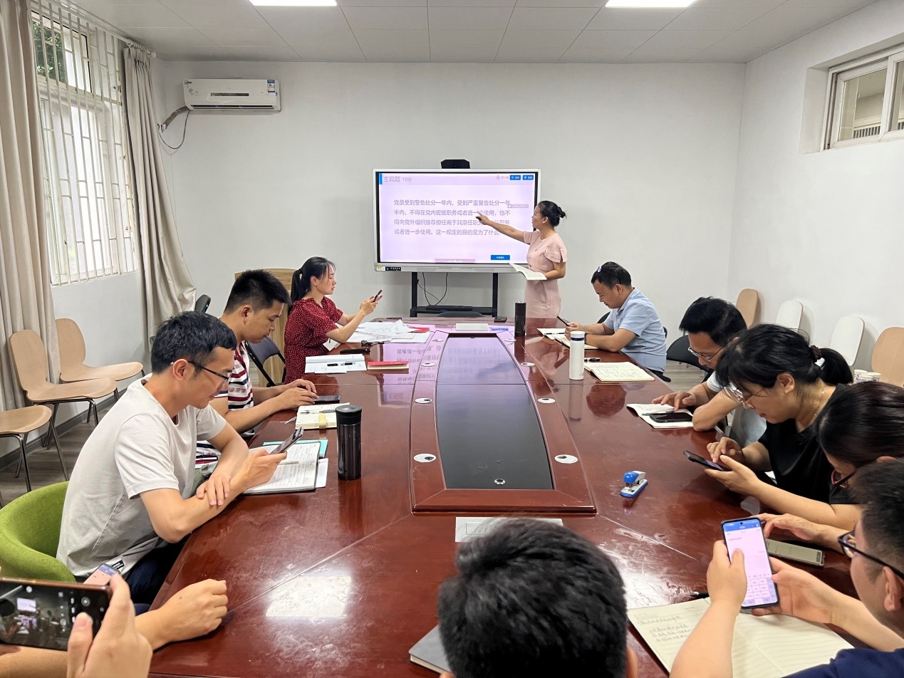 党支部书记曹敏惠详细解读了《中国共产党纪律处分条例》第一编总则的主要内容(图1),她要求支部党员同志要正确理解和把握《条例》传达出来的精神实质,将《条例》贯彻到实际工作和具体行动中去,以此规范和约束我们的个人行为;要主动接受思政政治教育、党的优良传统和作风教育、党规党纪和国家法律法规教育,用创新理论武装我们的头脑,树立积极向上世界观、人生观和价值观,自觉提高拒腐防变的能力,坚决抵制歪风邪气。支部还通过了雨课堂的主客观答题功能就党员理论学习的掌握情况进行了考察(图2),与会党员对于这种新的学习形式给予肯定,现场学习气氛非常浓厚。