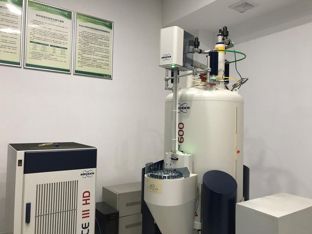 主要技术指标:5mm BBO正相观察宽带探头,H去偶,氘锁通道,标准宽带范围:31P ~ 109Ag,扩展到19F,主动屏蔽的Z-梯度线圈,ATM自动调谐,变温范围:-150 ~ -150℃,控温精度:0.1℃/℃;磁场强度14.1 T, 超屏蔽磁体系统;分辨率R ≤ 0.60 Hz (1H, 5 mm核磁管);分辨率R ≤ 0.20 Hz (13C,5 mm核磁管);灵敏度S/N ≥ 900 : 1 (1H,5 mm核磁管);灵敏度S/N ≥ 330 : 1 (13C,5 mm核磁管)。