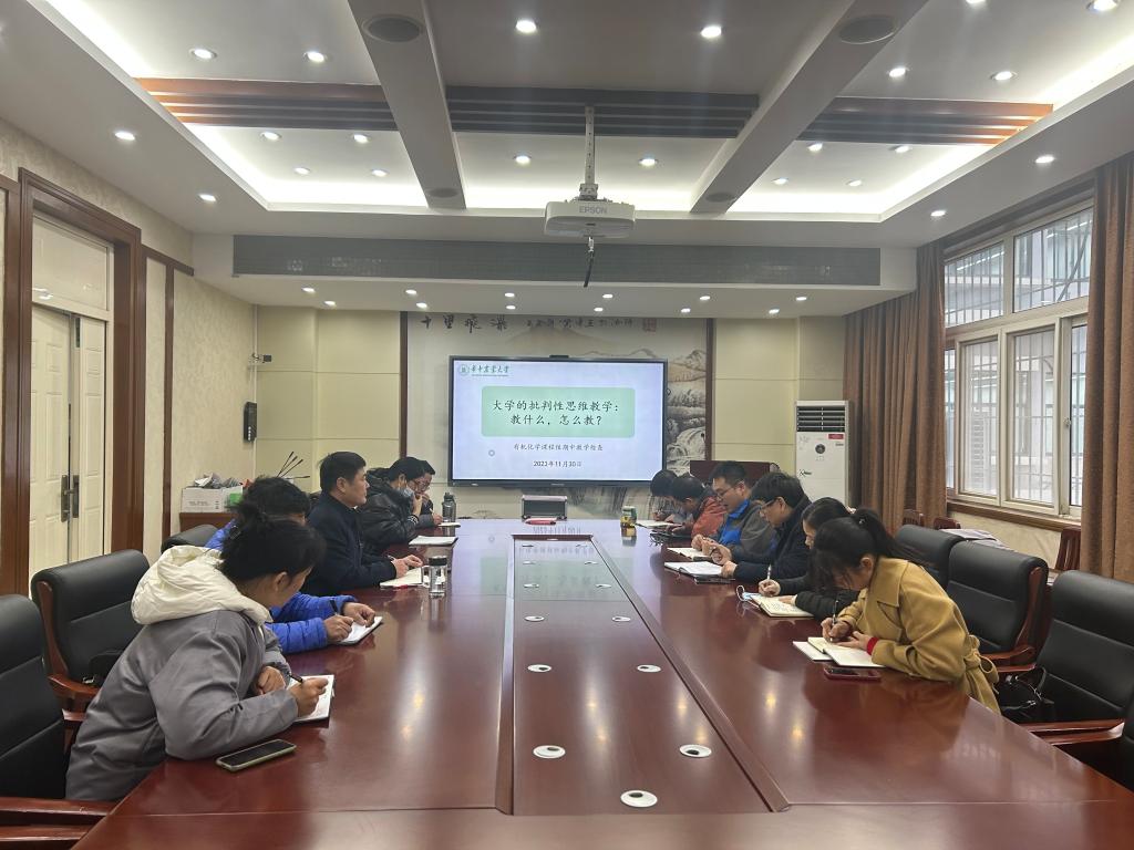 会议以“大学的批判性思维教学:教什么,怎么教?”为主题,以教学过程中存在的问题为导向,围绕有机化学相关课程存在的教学难点、教学方法以及如何培养新时代大学生的批判性思维开展了热烈的讨论。会议过程中,以江洪教授为首的有机化学课程组成员就自己开设的课堂发表言论,石炜老师表示自己在课程教学和考核中,注重引入绿色化学的理念和科学前沿文献,并结合课程思政和课后指导,让学生更加清醒的认识到夯实有机化学理论和实验基础,对于专业课程学习和专业素质的培养有很大帮助。刘思思和马济美老师在“如何培养学生批判性思维”上各自分享了自己的观点;刘思思表示要培养学生的批判性思维,首先要打牢学生的理论基础,才能让学生对于现有的学术观点提出自己独特的见解。马济美老师建议在课堂教学过程中,可以从生活的角度出发培养学生批判性思维。比如:甲醛是一种有害物质,但人们在生活中又不可避免地会去接触它,目前有哪些去除甲醛的方法?这些方法的原理又是啥?在教学过程中可以适当开设课堂讨论环节,以锻炼学生的批判性思维和语言表达能力。