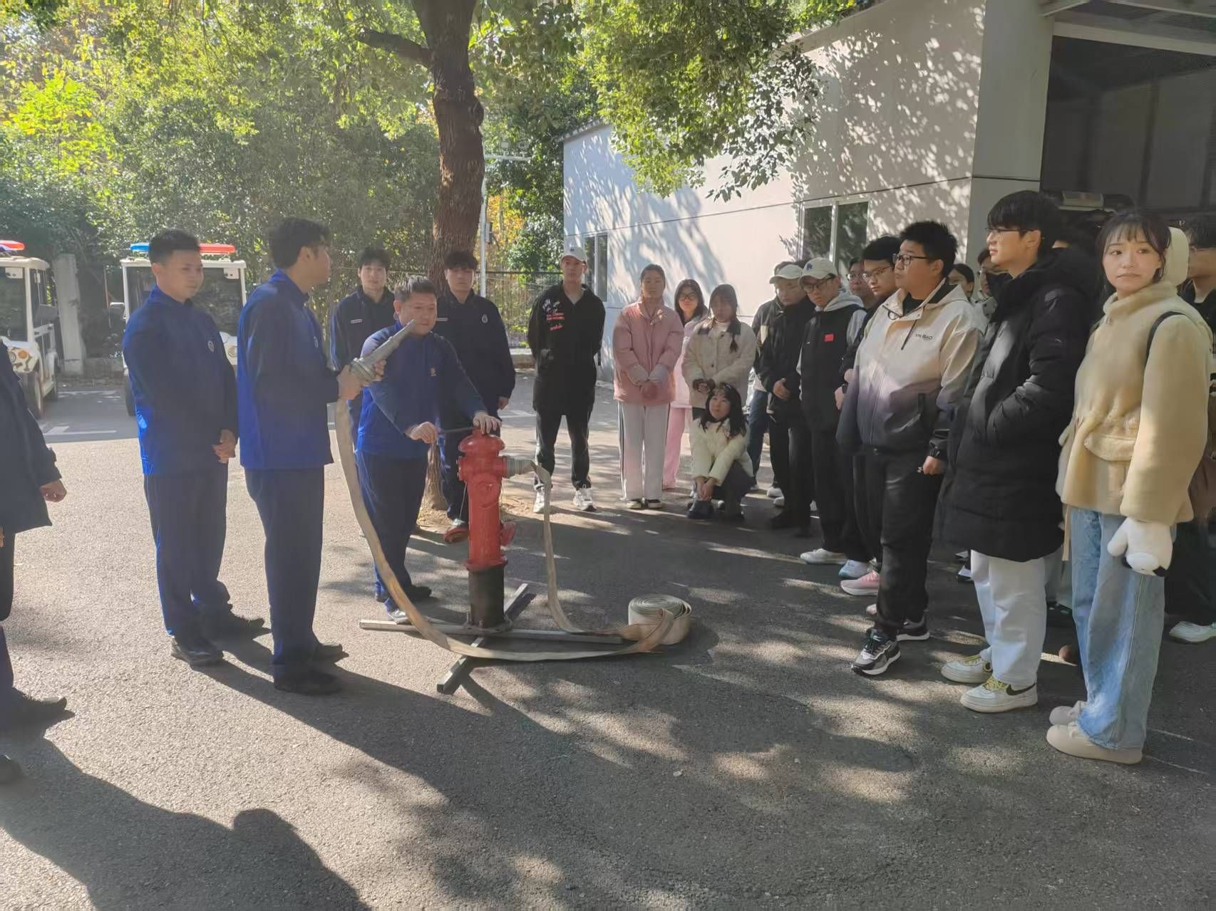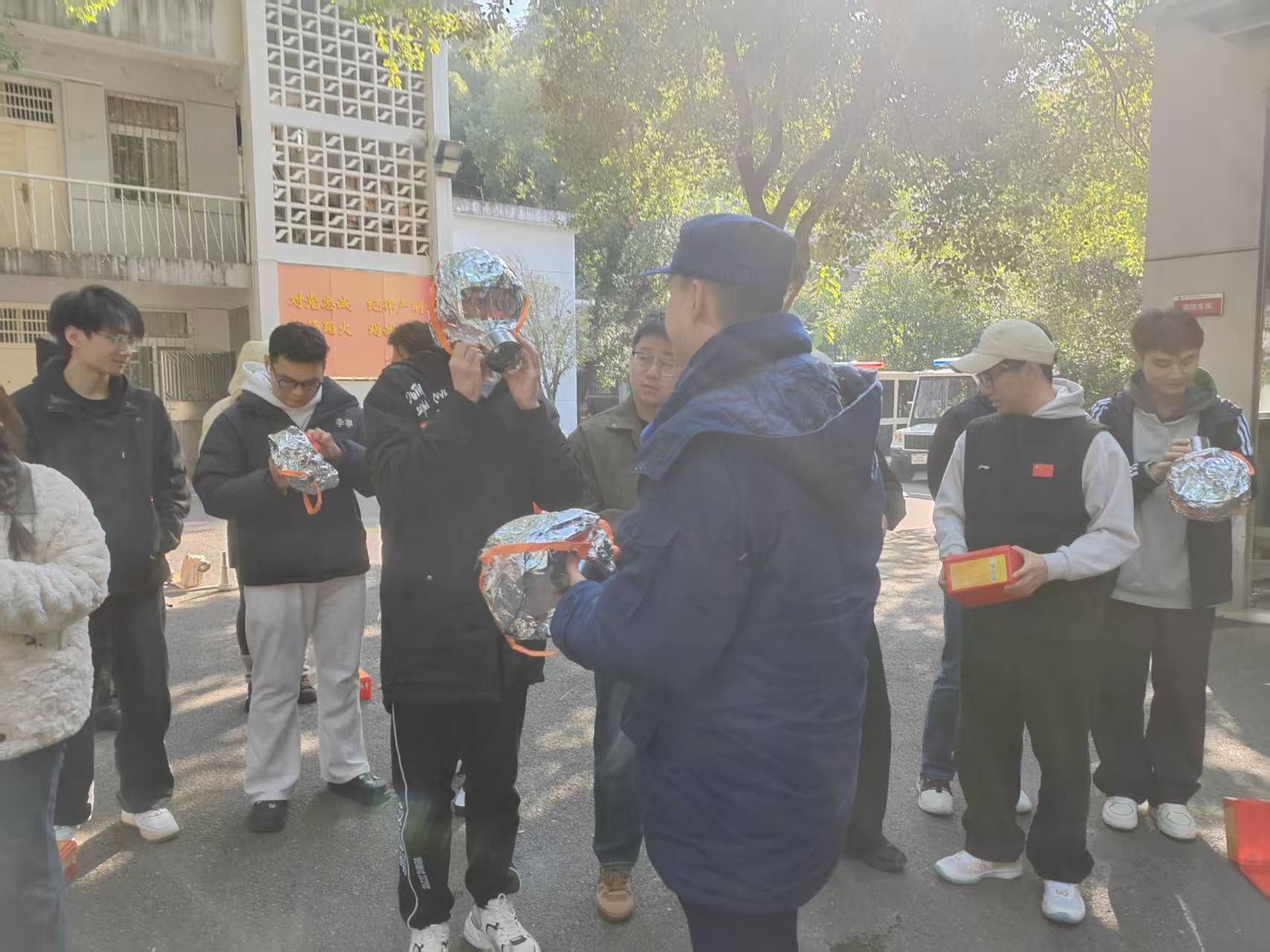 此次培训紧扣 “理论 + 实操” 相结合的原则,分三个核心环节有序推进。在消防设备使用示范环节,微型消防站的教官结合化学实验室及校园生活场景的特殊性,对消防栓的开启流程、接口连接技巧、水压调节方法,以及消防面具的佩戴步骤、密封检查要点等进行了手把手的现场教学。并强调,消防设备的规范使用是灭火成功的关键,尤其是在化学实验相关场景中,需根据火灾类型精准选择设备,避免因操作不当扩大险情。同学们认真聆听讲解,仔细观察动作细节,并不时提出疑问,教官逐一耐心解答,确保大家掌握核心操作要领。