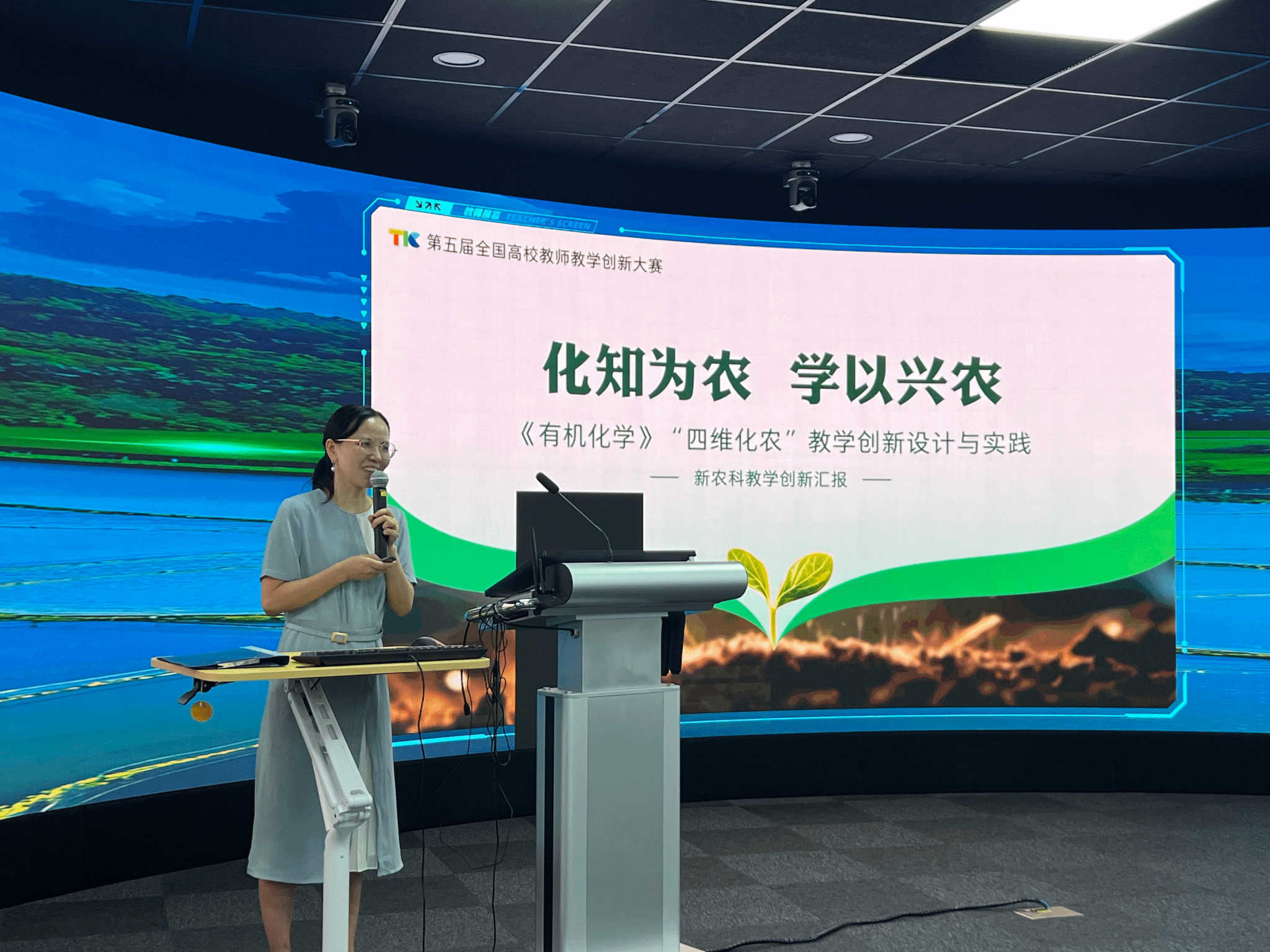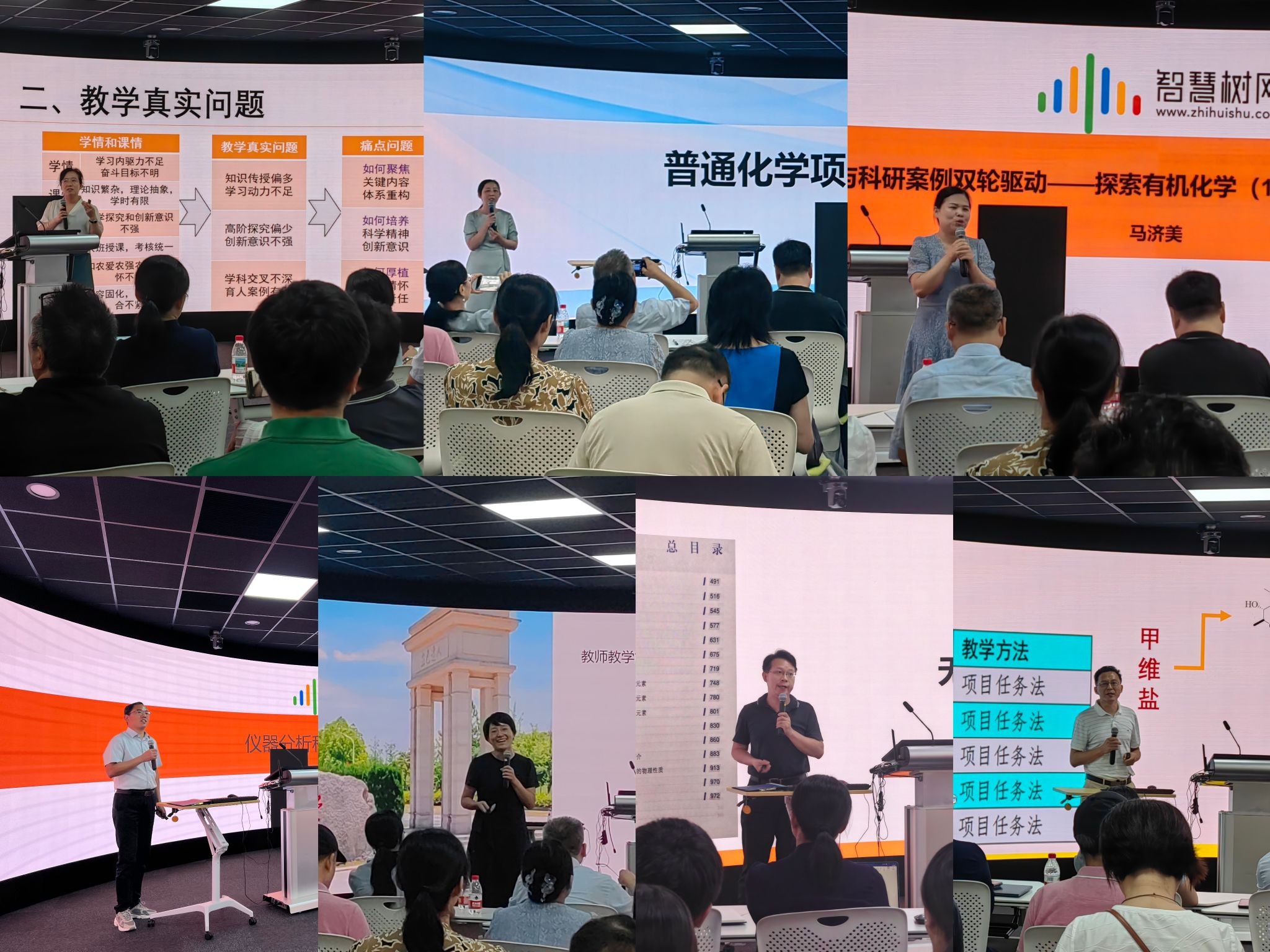 湖南农业大学王锦教授作题为《化知为农,学以兴农——有机化学“四维化农”教学创新设计与实践》的首场报告。她系统阐释了“四维化农”教学模型的构建逻辑,从目标定位、内容重构、方法创新与评价改革四个维度,全面呈现了有机化学与新农科建设深度融合的实践路径。该报告立足新农科人才培养前沿,内容充实、理念先进,为现场教师提供了富有启发性的教学改革思路。